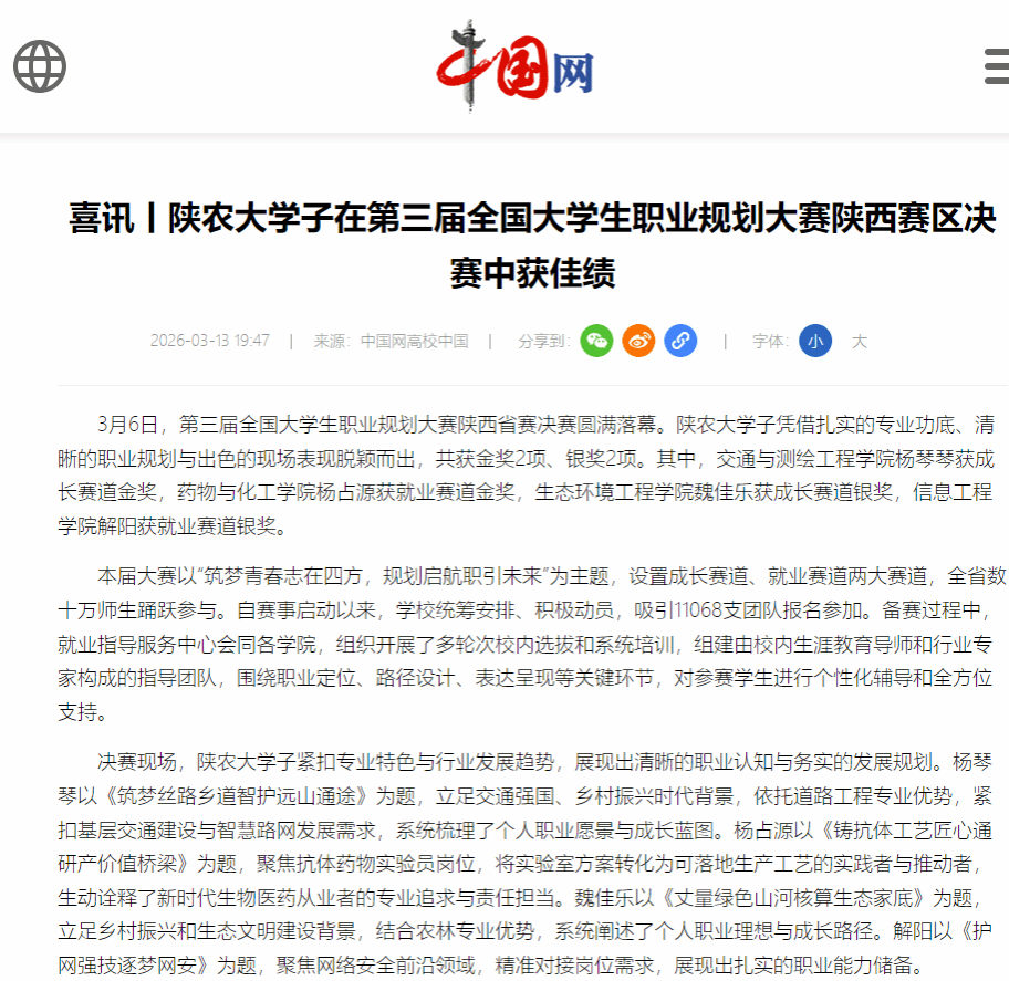 【中国网】喜讯丨陕农大学子在第三届全国大学生职业规划大赛陕西赛区决赛中获佳绩