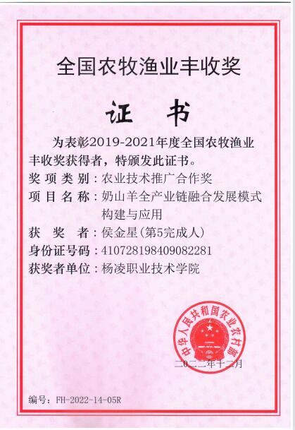 近日,2019—2021年度全国农牧渔业丰收奖获奖名单公布,我校动物工程学院侯金星副教授参与申报的“奶山羊全产业链融合发展模式构建与应用”项目,获得全国农牧渔业丰收奖农业技术推广合作奖,侯金星为第五完成人,杨凌职业技术学院为第五完成单位。
