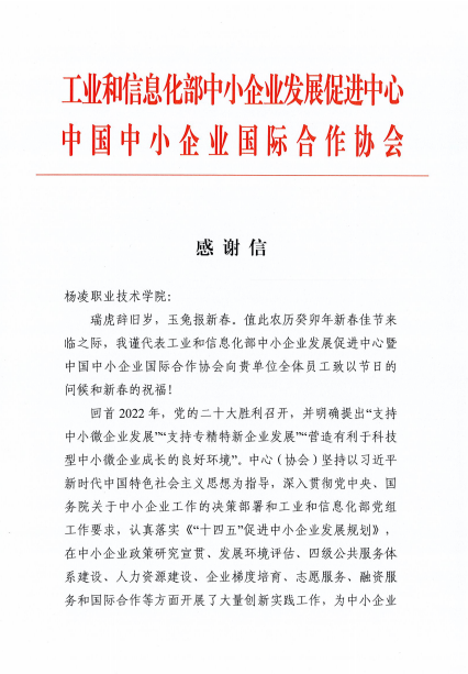 1月17日,新春佳节来临之际,工业和信息化部中小企业发展促进中心向我校发来感谢信,对我校在2022年给他们的支持和帮助表示衷心感谢,并希望在今后的工作中继续得到我校更大的支持。