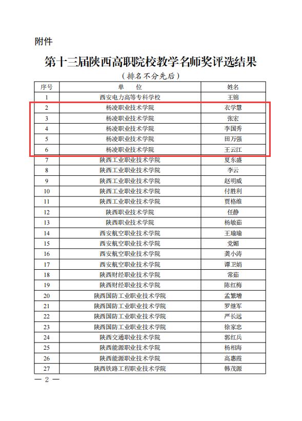 陕西高职院校教学名师奖是陕西高职院校优秀教师的重要奖项,是建设高水平师资队伍、全面落实立德树人根本任务的重要举措。本次全省共有49名教师获评陕西高职院校教学名师奖,我校获奖人数为历年来获评此类奖项最多。