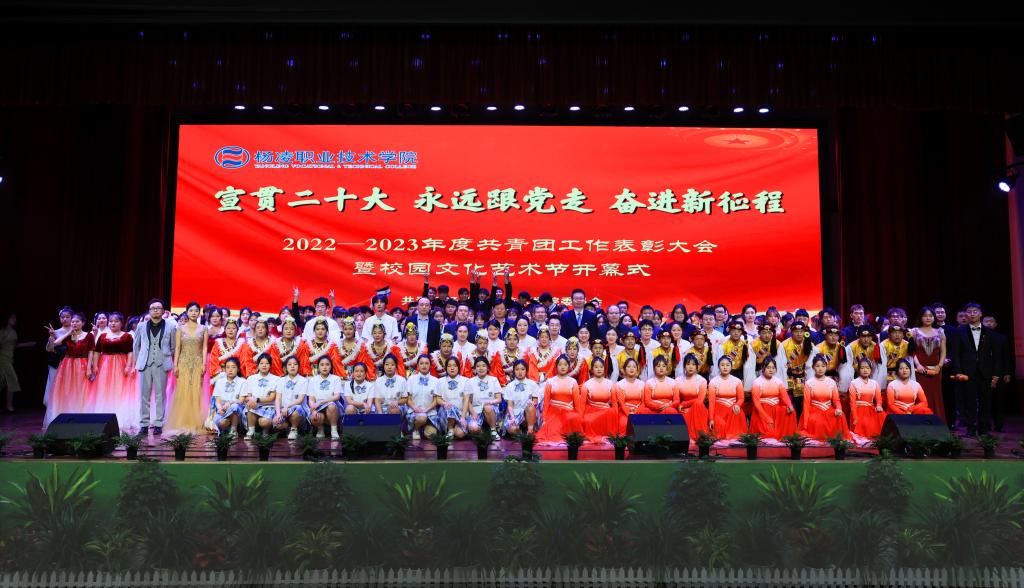 大会分为表彰大会、文艺汇演两个阶段。在表彰大会上,张朝晖宣读了《共青团杨凌职业技术学院委员会关于表彰2022-2023学年度先进集体及先进个人的决定》,学校领导为五四红旗团委、五四红旗团支部、优秀共青团干部、优秀共青团员等先进集体和个人颁奖。35名新发展团员代表进行了入团宣誓仪式。