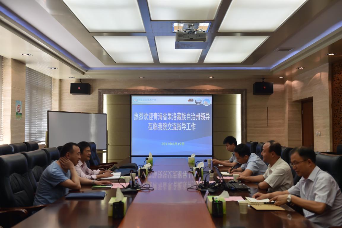 6月19日,青海省果洛藏族自治州秘书长刘志刚一行来访交流,学院党委书记赵曼、院长王周锁会见,招生就业处、水利工程分院负责人参加座谈会议。