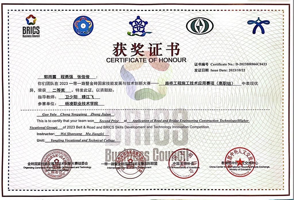 10月21日至22日,2023一带一路暨金砖国家技能发展与技术创新大赛-路桥工程施工技术应用技能竞赛决赛在西安举办,共有来自全国28个省份地区的179所院校323支队伍1500多名师生参赛。我校交通与测绘工程学院组成的两支代表队均获团体二等奖,学校获优秀组织奖,3名教师获得优秀指导教师。
