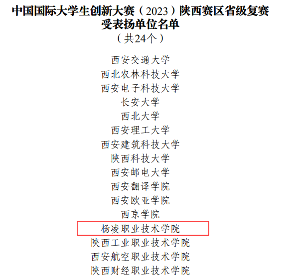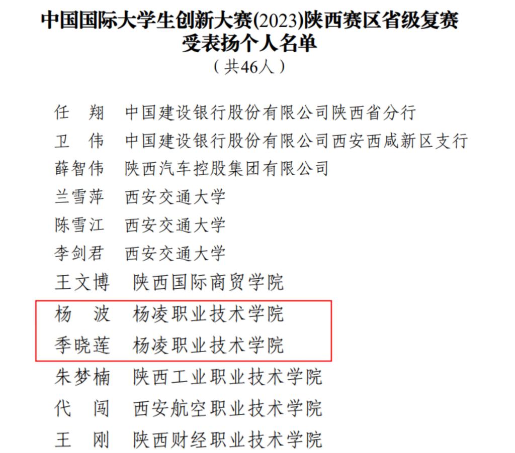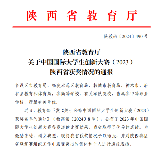 近期,省教育厅对中国国际大学生创新大赛(2023)陕西省获奖情况进行了通报,学校荣获陕西赛区省级复赛受表扬单位,创新创业学院杨波、生态环境工程学院季晓莲荣获受表扬个人。
