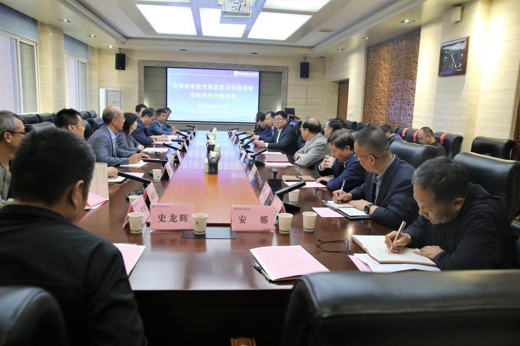 10月11日下午,西安航空职业技术学院党委书记金文、党委副书记王宏斌、副校长邓志博一行来校考察交流。党委书记韩明军、校长仲伟周、党委副书记刘瑞明、副校长祝战斌、胡俊鹏出席座谈会或陪同考察。