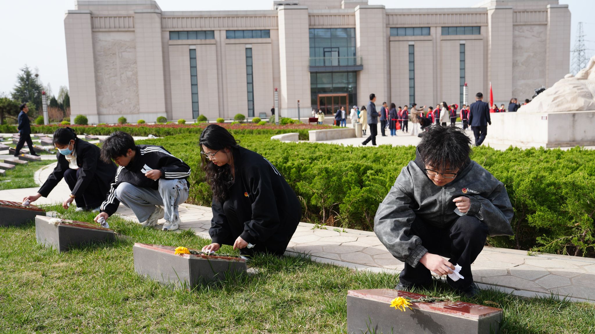 在扶眉战役纪念馆,师生驻足一件件历史文物、回顾珍贵的历史影像,重温了红色历史,深入了解了扶眉战役的历史背景、过程和伟大意义。张朝晖代表师生向革命烈士纪念碑敬献花篮,向革命先烈致以崇高的敬意和深切的悼念,师生集体默哀,行三鞠躬礼,在烈士墓区开展祭扫活动,为烈士一一擦拭墓碑,深切表达对革命先烈的追思。