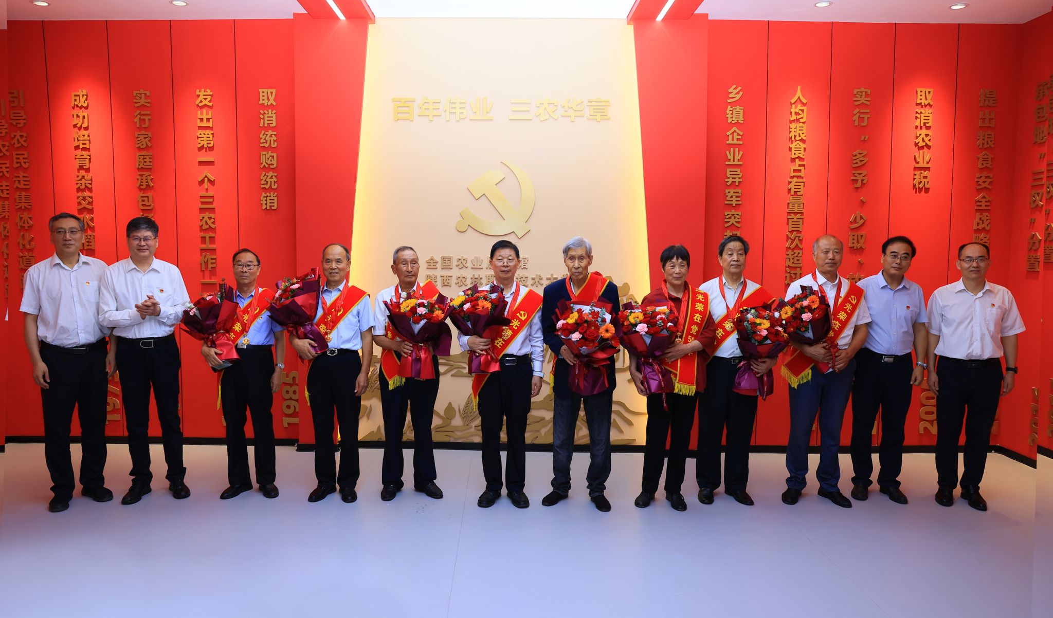 仪式上,史高领与韩明军共同为百年伟业·红色三农研学馆揭牌,杨卫东向研学馆授予“百年伟业 三农华章——庆祝中国共产党成立100周年主题展”巡展铭牌,陈文向研学馆授予“全省农村基层干部培训基地”铭牌,张小明向研学馆授予“杨凌示范区研学教育实践基地”铭牌。史高领、陈文、庄世宏、韩明军为学校8名老党员颁发了“光荣在党50年”纪念章。