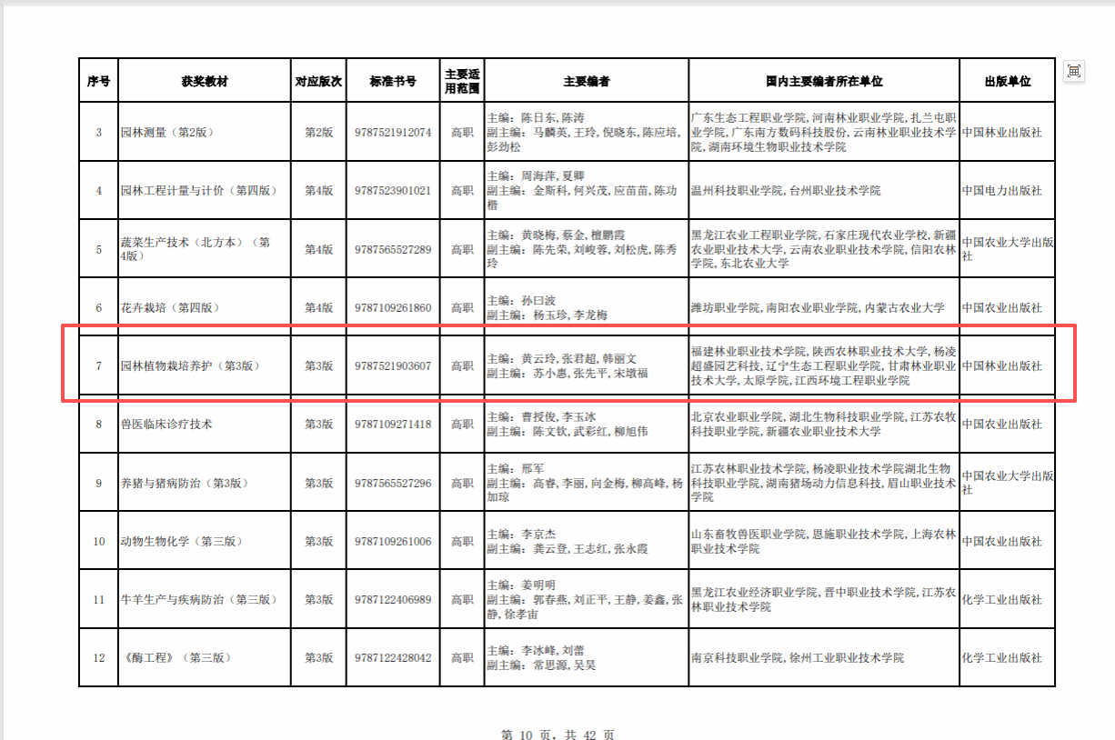 11月3日,第二届全国教材建设奖评选结果公示,此次评选全国共拟表彰优秀教材989种。我校生态环境工程学院衣学慧教授主编的《园林艺术》(第四版)、张君超副教授主编的《园林植物栽培养护》(第3版)两部教材,获全国教材建设奖(职业教育与继续教育类)二等奖。