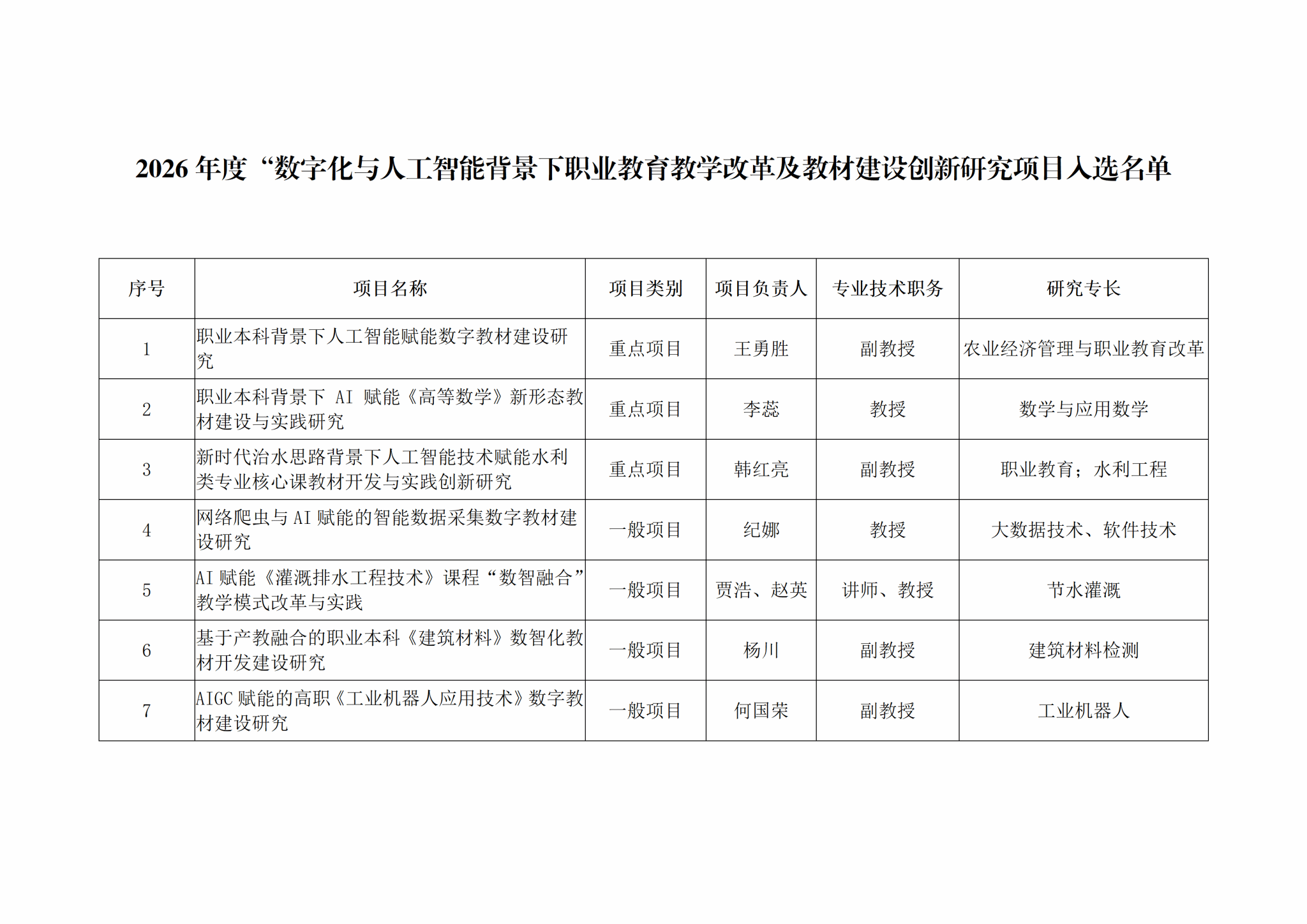 近日,教育部职业院校信息化教学指导委员会公示了2026年度数字化与人工智能背景下职业教育教学改革及教材建设创新研究项目评审结果,我校7个项目成功入选。