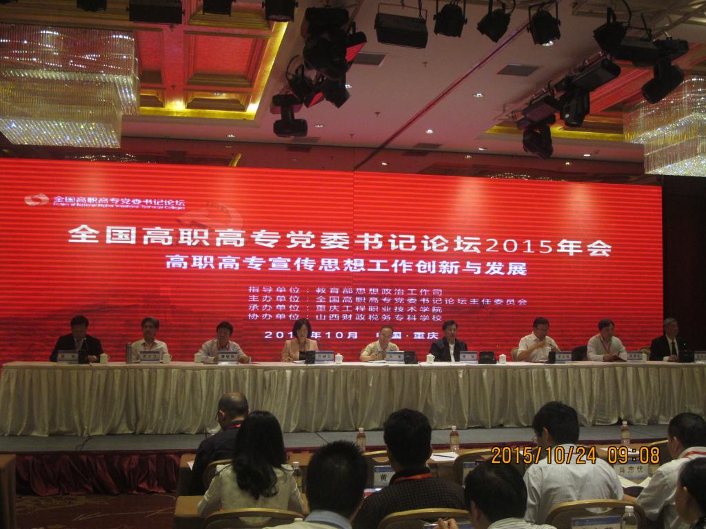 1023日至25日,我院党委书记赵曼、原党委书记曹毓刚与党政办负责人在重庆工程职业技术学院参加了全国高职高专党委书记论坛2015年会。