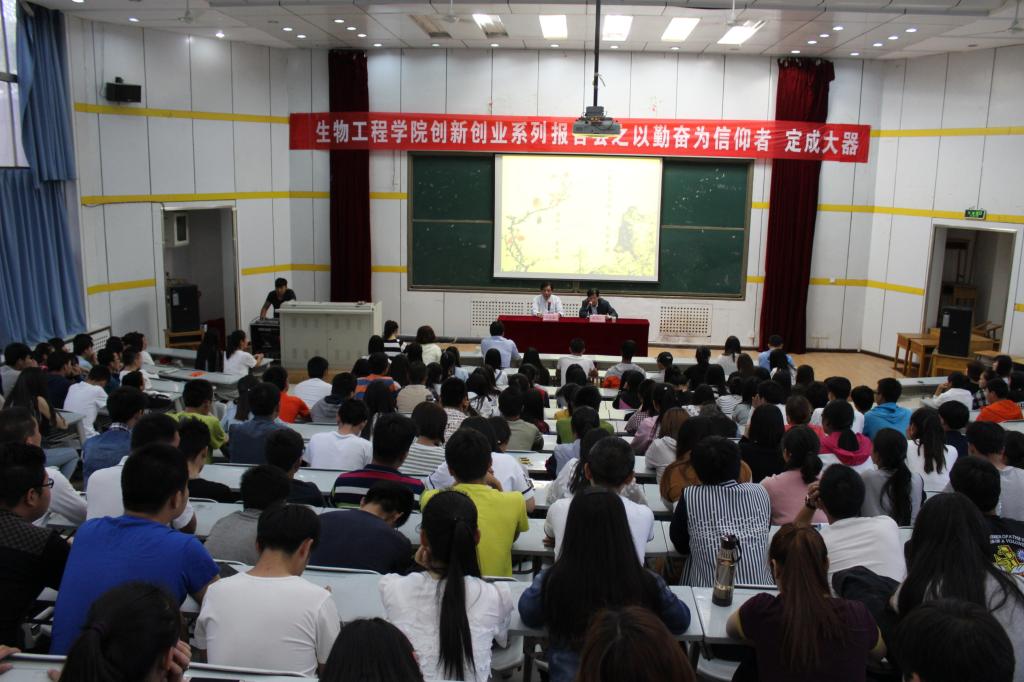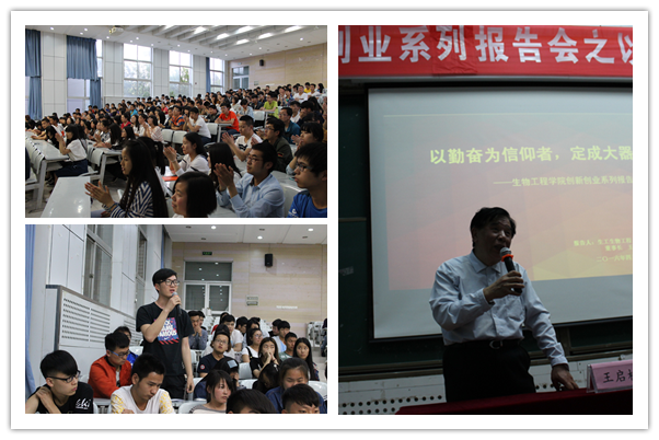 王启松教授以幽默轻快的语调开始了精彩的演讲,他从自己亲身经历出发,为大家介绍了他的学生时代、科研生涯和下海经商三个重要时期,并和大家分享了自己成功的秘诀——三高学习法,即高强度、高密度、高标准。王启松教授认为,“以勤奋为信仰者,定成大器”。他用自己丰富的人生阅历和成功经验,勉励莘莘学子不断努力,用勤奋铸造辉煌。与此同时,王教授还详细的叙述了自己艰苦的创业经历,结合自身在加拿大创建Biobasic Inc生物工程公司和在中国创办上海生工生物工程技术服务有限公司的经验,帮助同学们分析大学生创业过程中的实际问题。