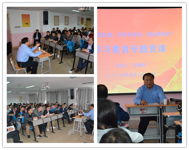 王周锁以《深刻理解党章、讲话,积极践行“两学一做”》为题,结合大量史实和案例,以清晰的发展脉络,解读了党章及系列讲话的精髓。他结合“两学一做”学习教育的内涵、提出背景、重要性以及合格党员的标准,就如何践行“两学一做”提出要求,强调全体师生党员要从实际出发,按照学院党委部署,加强党章党规学习,以主人翁的意识参与学院的各项建设,在工作中自觉争当先锋模范,不断推动各项工作再上台阶。