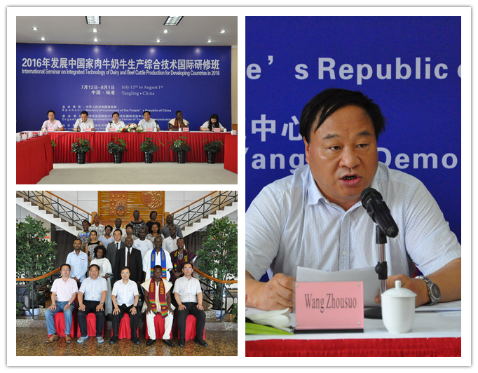,由商务部主办,杨凌示范区和我院共同承办的“2016年发展中国家肉牛奶牛生产综合技术国际研修班”在杨凌鑫诚田园山庄酒店举行开班典礼。来自巴拿马等8个国家的19名农业部门的官员、技术人员及杨凌示范区管委会有关领导与我院院长王周锁等参加了本期“研修班”的开班典礼。