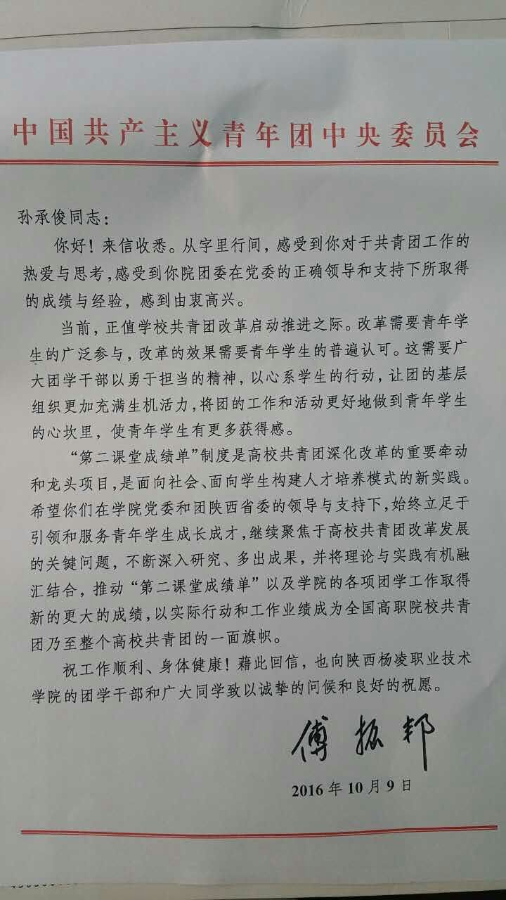109日,共青团中央书记处书记傅振邦同志来信我院,对我院团委在学院党政的正确领导和支持下所取得的成绩与经验给予了肯定,对共青团工作给予了指导,对实施的《大学生第二课堂成绩单》提出了新的要求,对我院的团学工作寄予了殷切希望,对我院团学干部及团员青年送上了诚挚的问候与良好的祝愿。