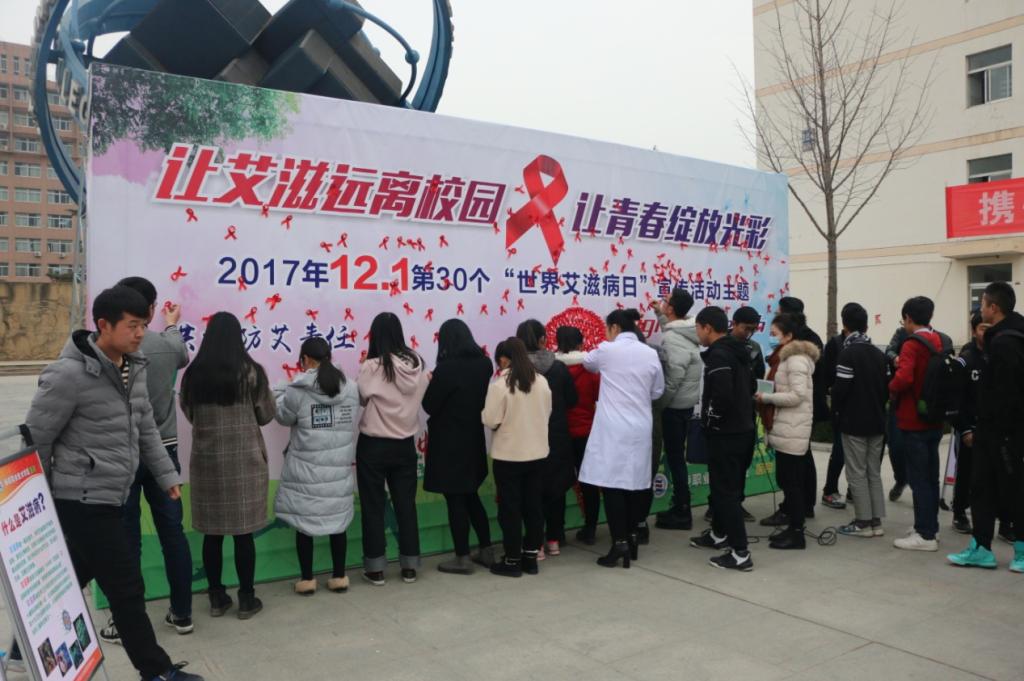 上午,在南校区中心广场,学院后勤处工作人员通过现场发放宣传资料、宣传手册和接受咨询等方式,向学生宣传艾滋病的危害、感染途径和预防措施等内容。校医院在全院开展了红丝带制作及签名活动,同学们踊跃地将自己制作的红丝带粘贴在背景墙上。