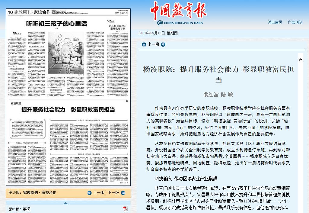 从减免建档立卡贫困家庭子女学费,到建立10县(区)职业农民培育学院、开设我国首个农民全日制学历教育班、成立水利特色订单班,再到结对帮扶宝鸡市太白县、麟游县和咸阳市旬邑县3个贫困县……杨凌职院立足自身优势,紧抓西部地域特点,因地制宜,独辟蹊径,走出了一条既符合时代要求又切合自身特点的办学新路子。
