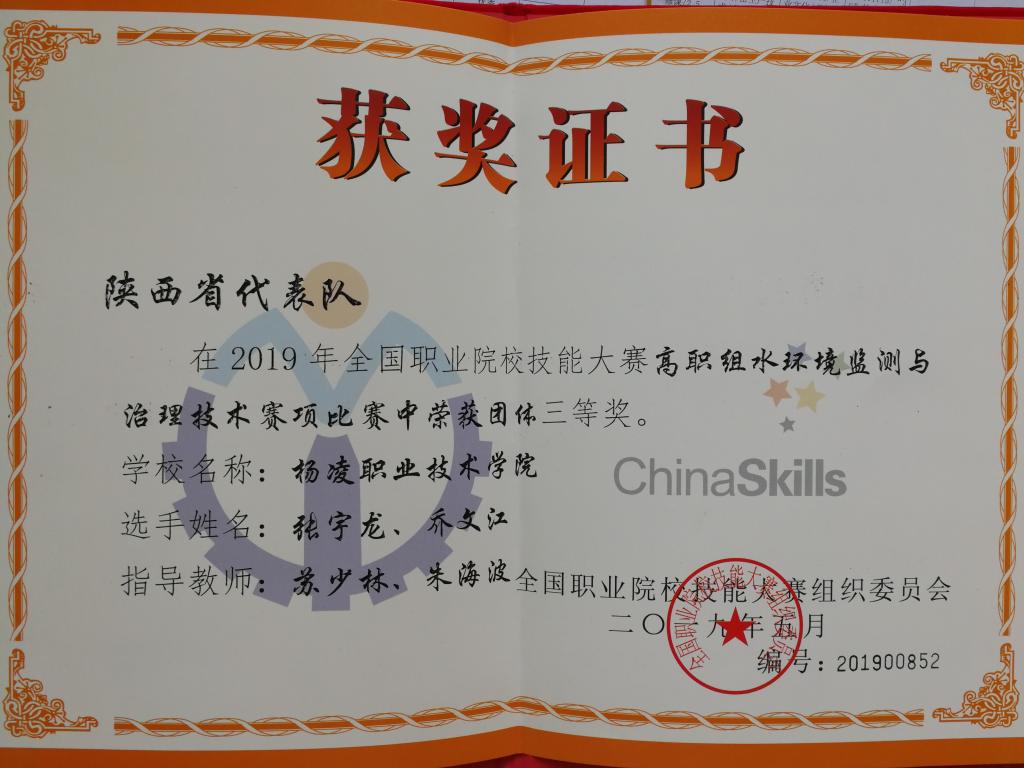 5月8日至11日,2019年全国职业院校技能大赛高职组“水环境监测与治理技术”赛项在天津现代职业技术学院举行,我院生态环境工程分院水环境监测与治理专业16001班学生张宇龙、乔文江组成的代表队荣获三等奖。
