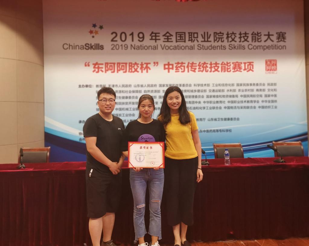 6月1314日,全国职业院校技能大赛“东阿阿胶杯”中药传统技能比赛在山东中医药高等专科学校举行,我院药物与化工分院中药制药专业17037班王丹同学发挥出色,荣获国赛二等奖,取得历史性突破。