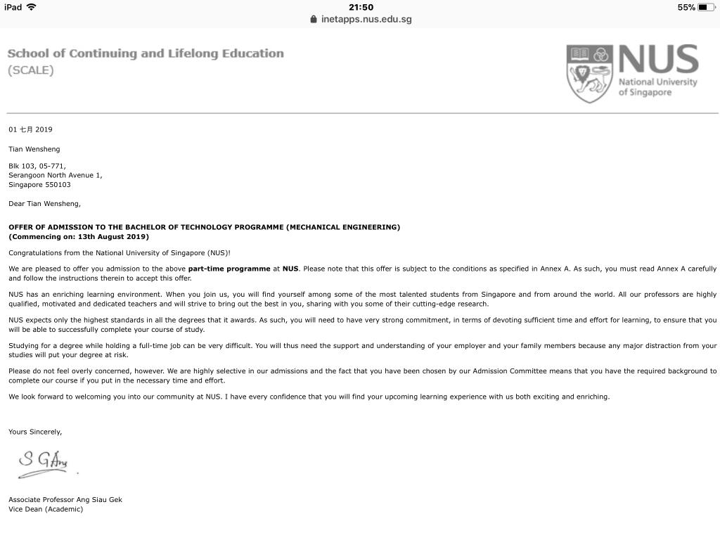 在新加坡工作的4年时间里,田文昇越来感到自己所学知识不能满足快速发展的社会需求,便萌生了在新加坡上大学深造的想法。2017年,田文昇经过系统考察了解新加坡大学报考条件和流程后,将新加坡国立大学(NUS)和南洋理工大学(NTU)两所世界名校确定为自己继续深造的心仪大学,在随后的2年时间里,田文昇白天工作,晚上挤出时间学习,终于在2019年6月全部顺利通过各项入学考试,被新加坡国立大学(NUS)工程学院机械工程专业录取,圆了他在新加坡继续求学深造的大学梦,为他自己的人生增添了浓墨重彩的一笔,也为杨凌职业技术学院的毕业生们树立了自我人生价值追求的标杆。