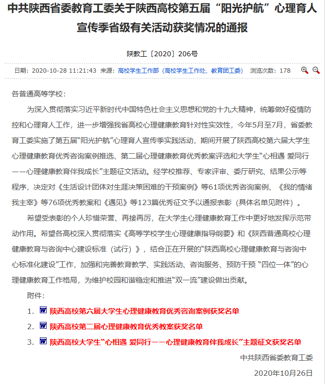 10月26日,省委教育工委公布了陕西高校第五届“阳光护航”心理育人宣传季省级有关活动获奖情况我院交测分院城市轨道交通运营管理19024班学生周银萍的《我们与爱,感同身受信工分院计算机信息管理19027班学生敬璇让爱的阳光照耀心灵成长荣获主题征文二等奖此外,我院教师雒淼淼情商修炼——大学生情绪管理”荣获心理健康教育优秀教案三等奖。