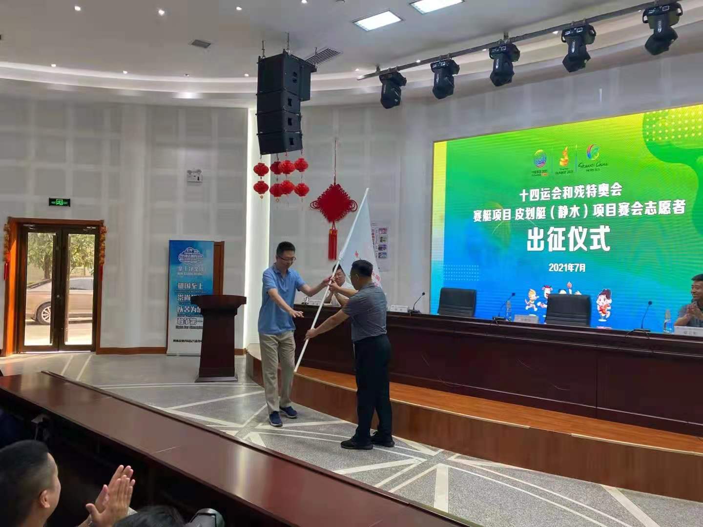 7月4日,十四运会残特奥会赛艇皮划艇(静水)项目志愿者出征仪式在省水上运动管理中心举行校团委书记陈吼代表我校志愿者服务队接旗。