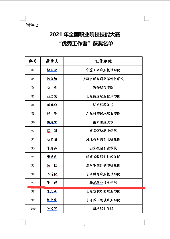 近日,全国职业院校技能大赛执行委员会公布了2021年全国职业院校技能大赛“突出贡献奖”、“优秀工作者”和“优秀裁判员”获奖名单,我校荣获“突出贡献奖”,生物工程学院副院长王燕被评为“优秀工作者”。