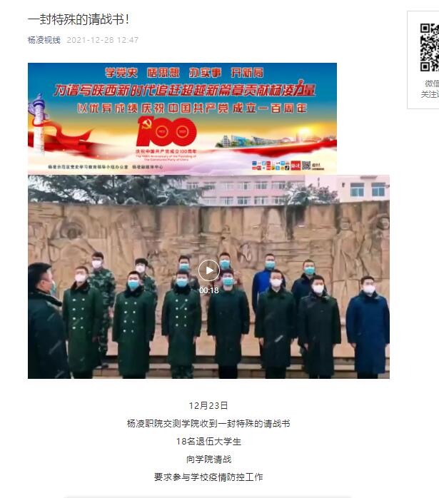 自西安疫情发生以来,一直未迎来拐点,杨凌职院也在示范区、杨陵区防控指挥办的指导下,严格落实疫情防控措施,以保证学生们的安全。但看到陕西每天确诊人数不断增加,杨凌职院退伍大学生赵赫再也坐不住了。