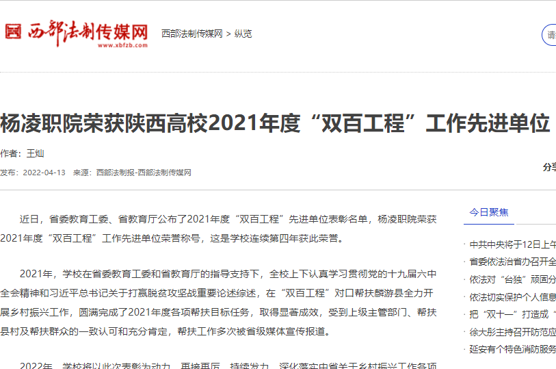 【西部法制传媒网】杨凌职院获陕西高校2021年度“双百工程”先进单位