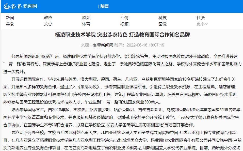 【各界新闻网】杨凌职业技术学院 突出涉农特色 打造教育国际合作知名品牌