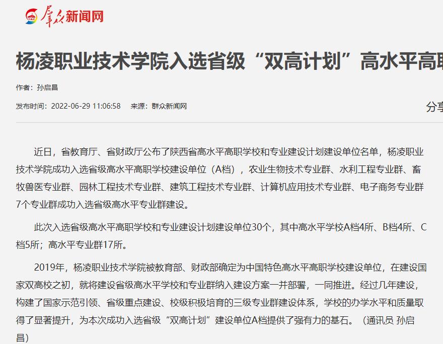 【群众新闻网】杨凌职业技术学院入选省级“双高计划”高水平高职学校A档建设单位