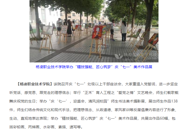 【杨凌职业技术学院】该院召开庆“七一”处级以上干部座谈会,大家重温入党誓词,进一步坚定听党话、感党恩、跟党走的理想信念;举行“正禾”育人工程之“爱党之情”文艺晚会,师生们载歌载舞庆祝党的生日;举办“庆‘七一’,迎盛会,清风润校园”师生书法美术摄影展,展出师生作品138件,师生们结合传统文化和现代手法,把理想信念、从政道德、家风家训等反腐倡廉内容进行了形象、生动、直观地表达表现;举办“精技强能、匠心筑梦”庆“七一”美术作品展,共展出作品60幅,包括彩铅画、丙烯画、水彩画、素描、速写等。