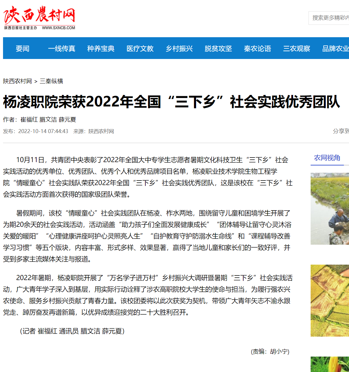 【陕西农村报】杨凌职院荣获2022年全国“三下乡”社会实践优秀团队