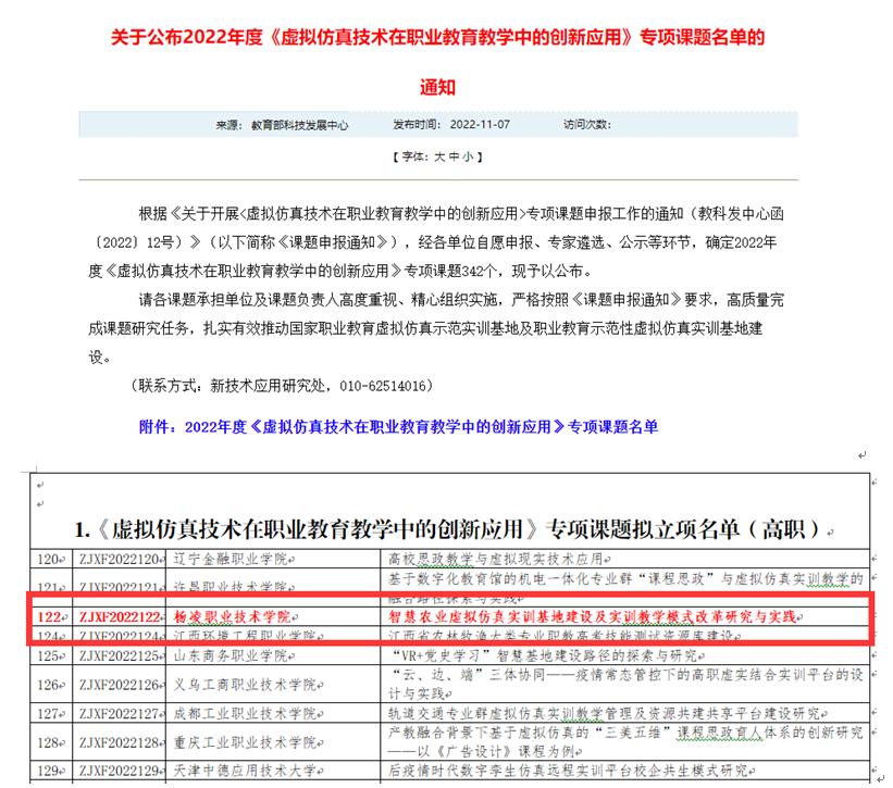 11月7日,教育部公布2022年度“虚拟仿真技术在职业教育教学中的创新应用”专项课题名单。杨凌职业技术学院申报的“智慧农业虚拟仿真实训基地建设及实训教学模式改革研究与实践”课题获批立项。