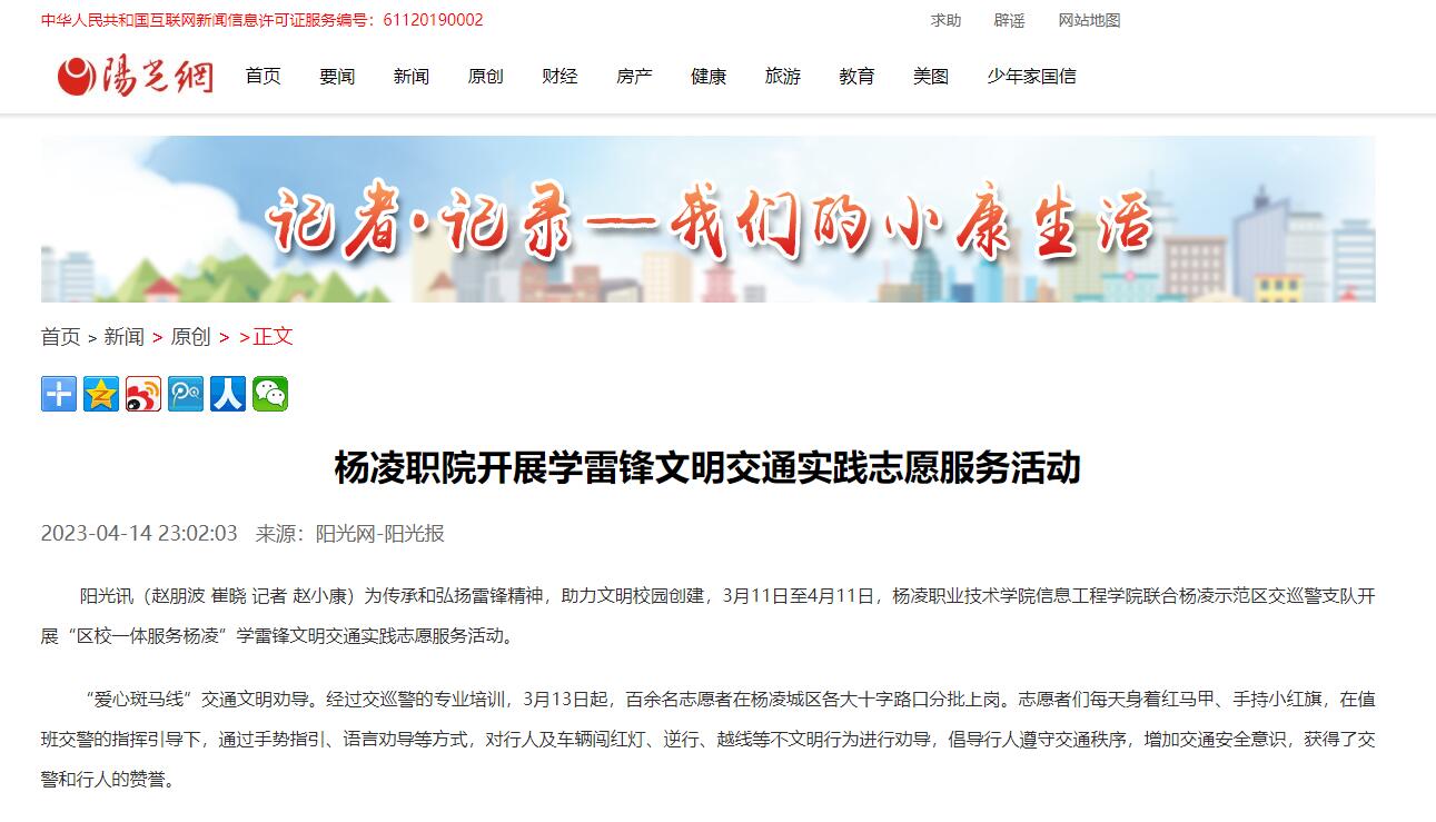 阳光讯(赵朋波 崔晓 记者 赵小康)为传承和弘扬雷锋精神,助力文明校园创建,3月11日至4月11日,杨凌职业技术学院信息工程学院联合杨凌示范区交巡警支队开展“区校一体服务杨凌”学雷锋文明交通实践志愿服务活动。