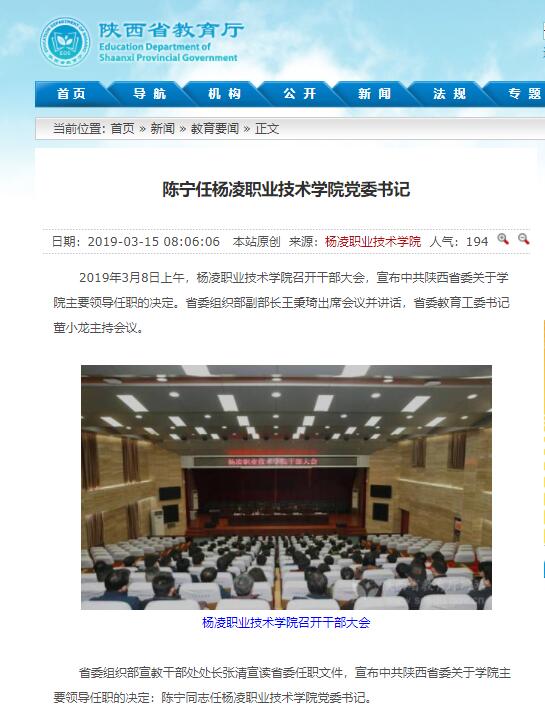 【陕西省教育厅】陈宁任杨凌职业技术学院党委书记