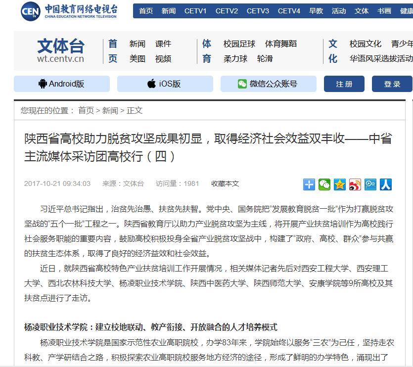 在脱贫攻坚工作中,杨凌职业技术学院探索形成了“技术服务型、基地示范型、科技包村型、专家大院型和企业带动型”等五种产学研示范推广模式。
