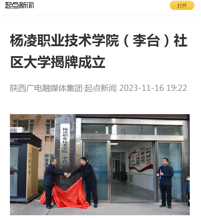 “杨凌职业技术学院(李台)社区大学揭牌成立,旨在深入推进职业教育服务乡村振兴向社区走深走实,扎实推进全民终身教育和全民终身学习型社会建设,进一步推动区校融合,助力基层治理现代化,为高效社会治理提供职业教育智慧和校政融合方案。”杨凌职业技术学院乡村振兴学院院长黄璞表示:“下一步将聚焦党建引领基层治理现代化,加快建设‘一校一平台 四库多基地’‘社区支持产业、治理助力发展’的新模式,围绕社区文化建设、社区产业振兴等群众美好生活向往,开展治理能力提升培训、技术技能培训以及学历继续教育、基层治理研究等工作。”