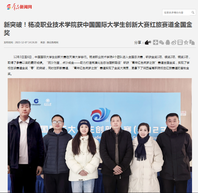 12月3日至6日,中国国际大学生创新大赛在天津大学举行。杨凌职业技术学院4个团队进入全国总决赛,斩获金奖1项、银奖2项、铜奖1项,取得了参赛以来的最好成绩。“抚沙为茵,点沙成金——助力打造荒漠化生态治理新路径”斩获“青年红色筑梦之旅”赛道全国金奖,实现了学校在该赛道金奖“零”的突破,同时在职教赛道、“青年红色筑梦之旅”赛道实现了金奖大满贯,更拿下了陕西省高职院校在红旅赛道的首枚金奖。