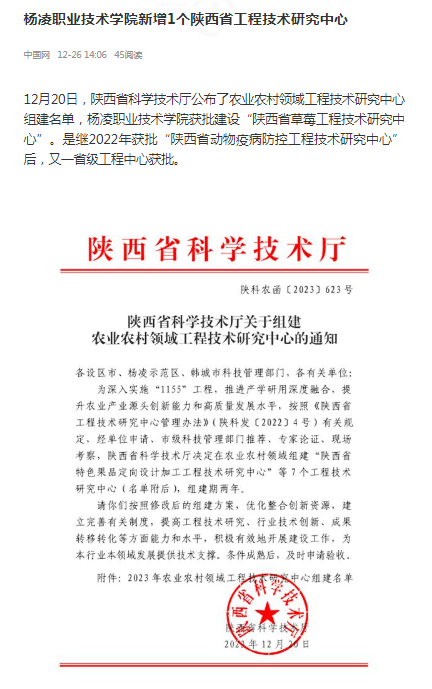 【陕西头条】杨凌职业技术学院新增1个陕西省工程技术研究中心