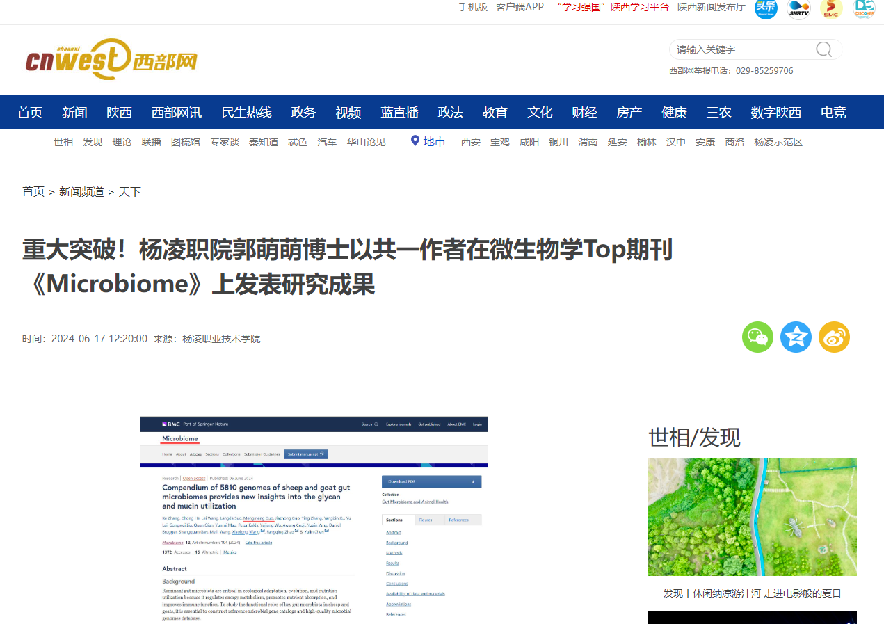 【西部网】重大突破!杨凌职院郭萌萌博士以共一作者在微生物学Top期刊《Microbiome》上发表研究成果