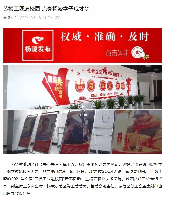 为持续推动全社会关心关注劳模工匠,掀起崇尚技能成才热潮,更好地引导职业院校学生树立技能报国之志,坚定理想信念,6月17日,以“走技能成才之路、做技能报国之士”为主题的2024年全国“劳模工匠进校园”示范活动走进杨凌职业技术学院。陕西省总工会党组成员、副主席王永岗出席。杨凌示范区党工委委员、管委会副主任,示范区总工会主席刘仲山出席并致欢迎辞。