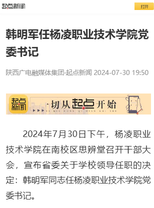 2024年7月30日下午,杨凌职业技术学院在南校区思辨堂召开干部大会,宣布省委关于学校领导任职的决定:韩明军同志任杨凌职业技术学院党委书记。