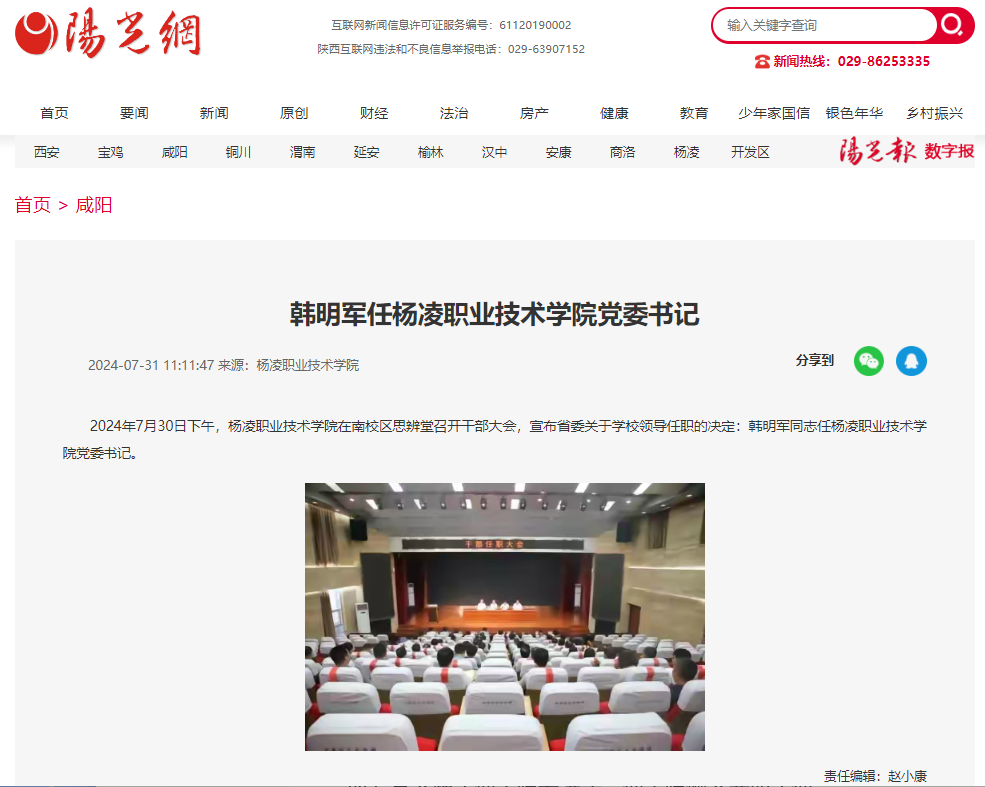 2024年7月30日下午,杨凌职业技术学院在南校区思辨堂召开干部大会,宣布省委关于学校领导任职的决定:韩明军同志任杨凌职业技术学院党委书记。