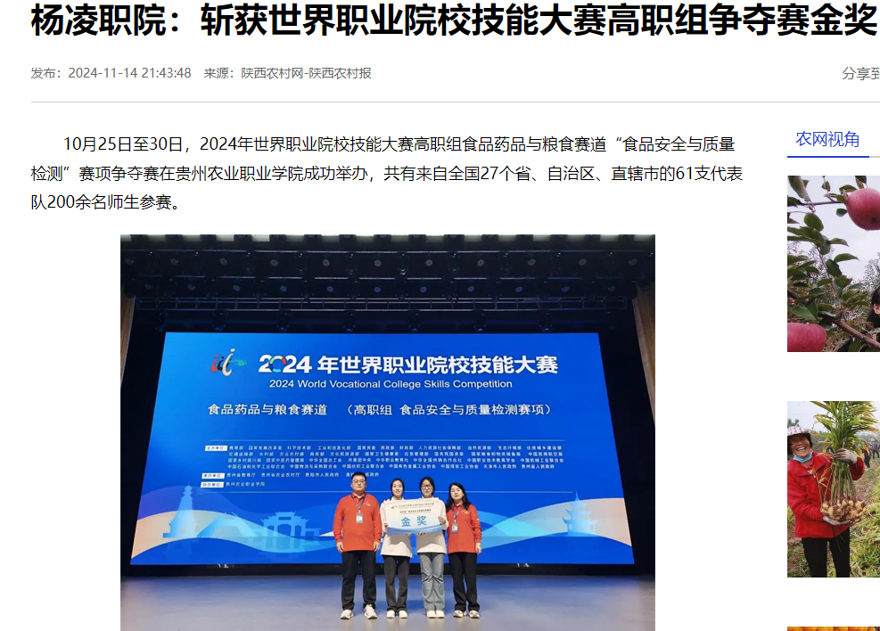 由杨凌职业技术学院生物工程学院张红娟、崔利辉老师指导,杜晶晶、刘蕊华同学组成的代表队以卓越的现场发挥和扎实的专业技能操作勇夺金奖,位列小组第一名。