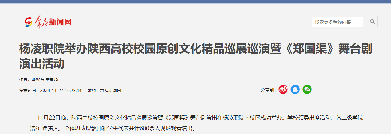 自2021年9月启动以来,《郑国渠》创作团队以郑国入秦兴修水利工程为线索,采取实际走访、查阅文献等方式广泛搜集历史资料,从中挖掘梳理郑国受命主持修建灌溉渠的原初“疲秦”设想和最终“灌溉关中沃野”推动农业生产的目的,并在情节设计中渗透郑国力主保护陕西关中生态想法,将学校的农林水办学特色与剧本创作紧密结合。2023年11月,《郑国渠》举行首场正式演出,社会反响热烈。2024年6月,经省委教育工委遴选确定,《郑国渠》入选陕西高校校园原创文化精品并纳入巡展巡演集中展演活动。