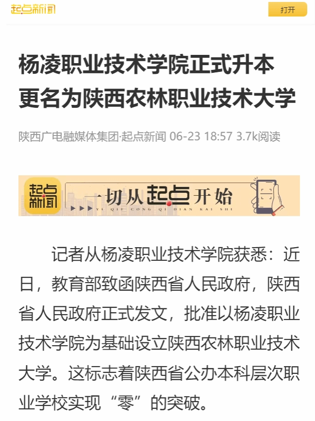 记者从杨凌职业技术学院获悉:近日,教育部致函陕西省人民政府,陕西省人民政府正式发文,批准以杨凌职业技术学院为基础设立陕西农林职业技术大学。这标志着陕西省公办本科层次职业学校实现“零”的突破。