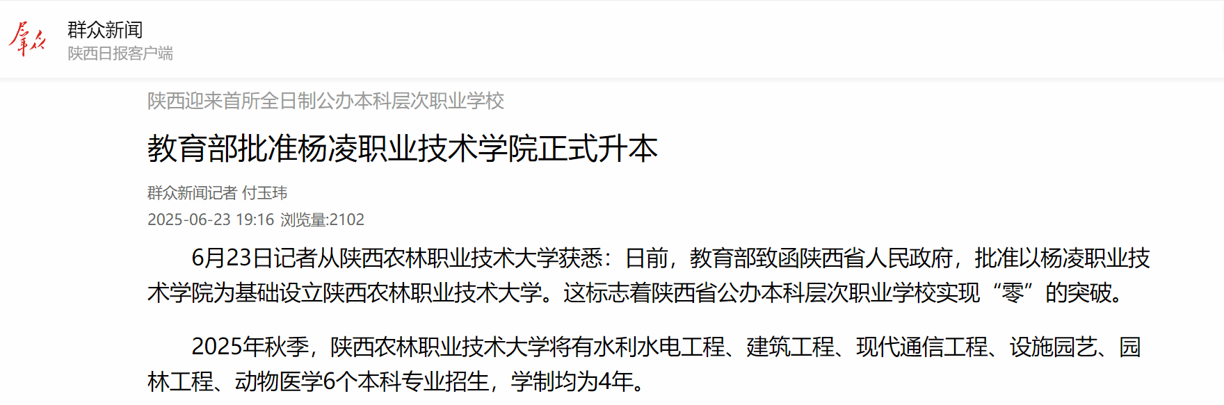 【群众新闻网】陕西迎来首所全日制公办本科层次职业学校 教育部批准杨凌职业技术学院正式升本