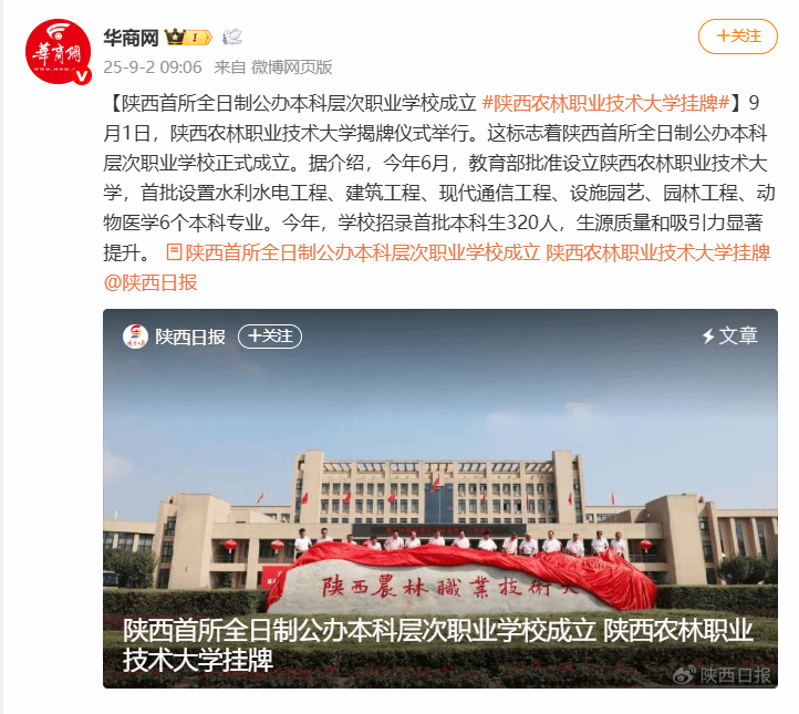 9月1日,陕西农林职业技术大学揭牌仪式举行。这标志着陕西首所全日制公办本科层次职业学校正式成立。据介绍,今年6月,教育部批准设立陕西农林职业技术大学,首批设置水利水电工程、建筑工程、现代通信工程、设施园艺、园林工程、动物医学6个本科专业。今年,学校招录首批本科生320人,生源质量和吸引力显著提升。