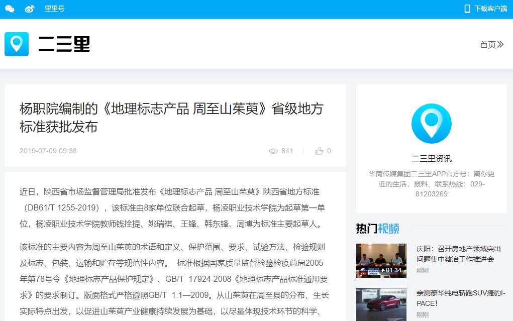 长期以来,杨凌职业技术学院积极引导和鼓励科研人员在主动服务地方经济社会发展的实践中,注重与行业主管部门和有关企业协同创新,注重高校科技进步成果的转化应用。《地理标志产品 周至山茱萸》的发布,是杨凌职业技术学院与其他7家单位的集体智慧结晶,也是对杨凌职业技术学院进一步深化产学合作内涵的有力促进。