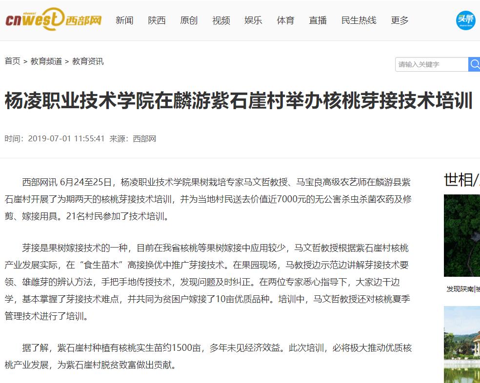 西部网讯 6月24至25日,杨凌职业技术学院果树栽培专家马文哲教授、马宝良高级农艺师在麟游县紫石崖村开展了为期两天的核桃芽接技术培训,并为当地村民送去价值近7000元的无公害杀虫杀菌农药及修剪、嫁接用具。21名村民参加了技术培训。